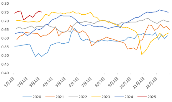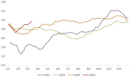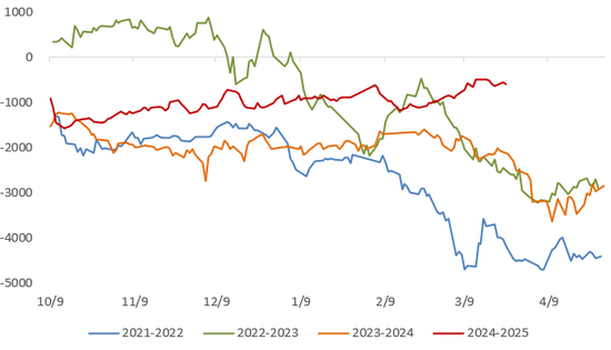 2024年9月后能繁母猪存栏量基本陷入区间震荡,但其绝对值高于正常保有量,同时养殖效率仍在提升(PSY),因此对应仔猪及育肥猪供应仍在增加。在3月策略报告中我们已经对已知母猪存栏和效率的问题进行过具体解释(产能趋势类似2023年),在此不再赘述。
