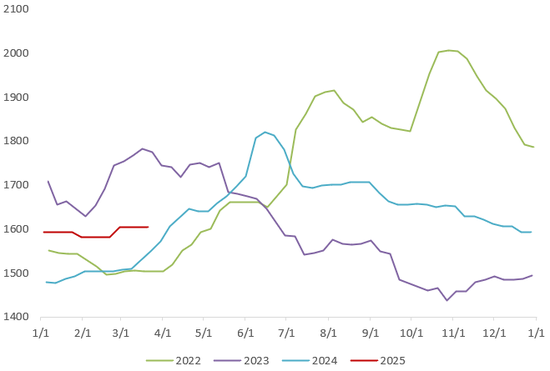 截至2025年3月,卓创资讯显示冻品库容为18.68%,处于历史同期相对偏低水平。一般来说,上半年为冻品做库存的旺季,但2025年春节后由于猪价下跌幅度有限(未跌破14元/kg),主动入库热情不高,多为被动或刚需入库为主。当前猪价绝对值偏低,部分冻品价格高于鲜品,导致冻品竞争力下降,以采购鲜品为主。冻品虽不会直接影响毛猪价格表现,但需关注低库存水平下,现货若出现大幅回落,下方存在拖底力量。